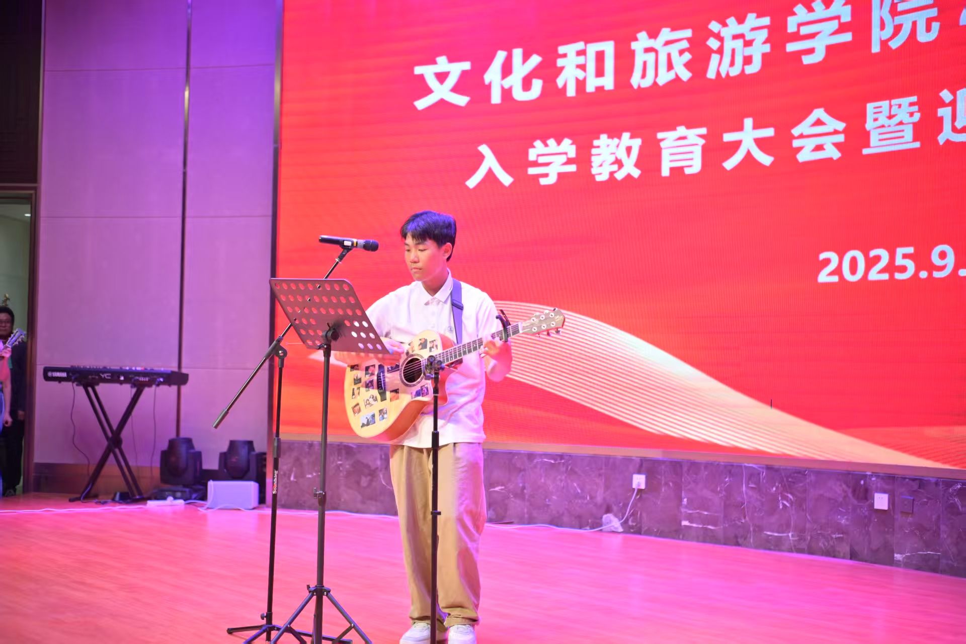 9月25日下午,williamhill威廉希尔“薪火相传 启程文旅”2025级新生入学教育大会暨迎新文艺演出在济南老年人大学报告厅隆重举行。学院全体党政领导班子成员,各系教师代表、全体辅导员、新生班主任以及2025级全体本科生和研究生共同参加了这场青春盛典。