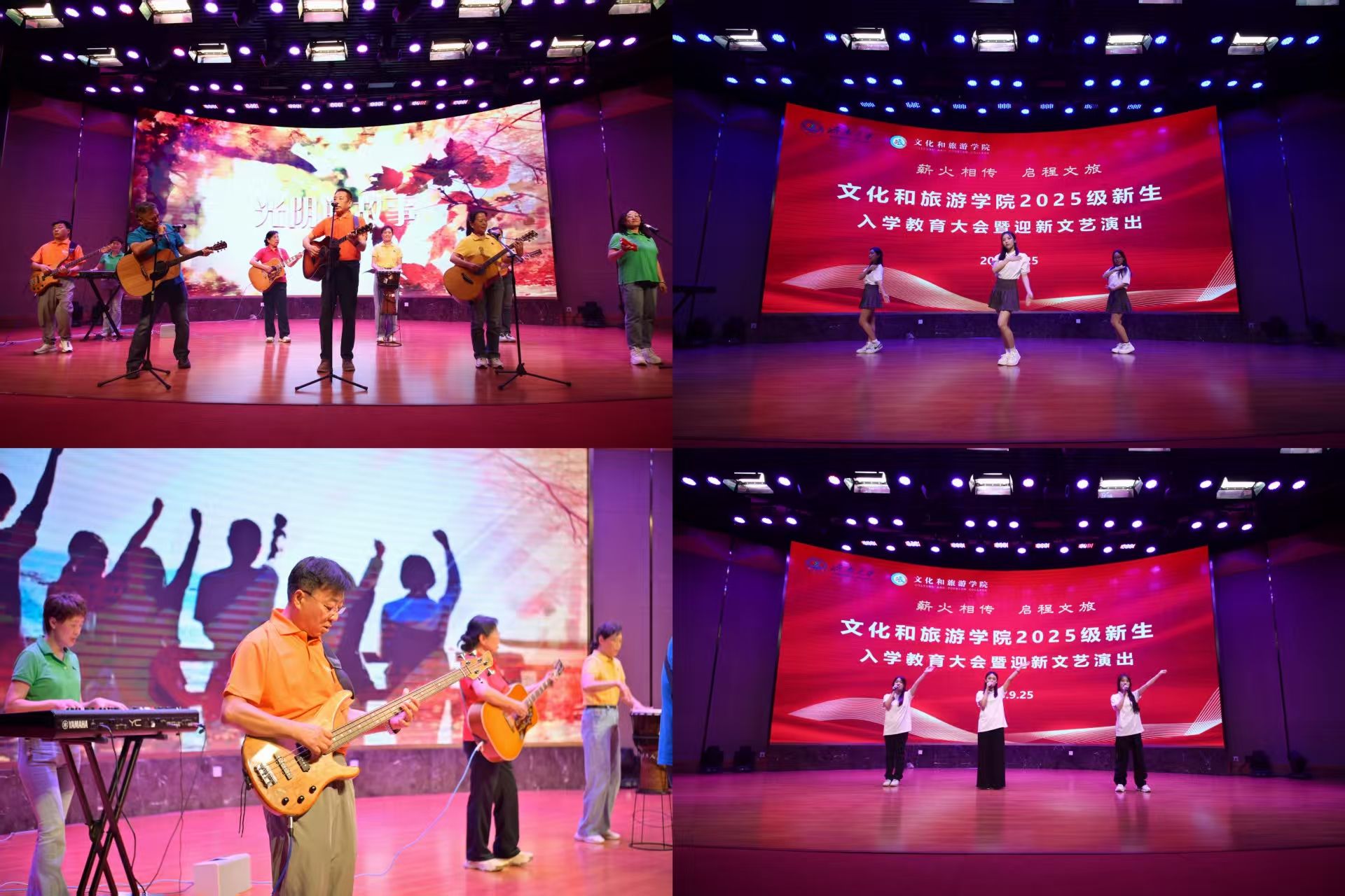 入学教育大会结束后,学院与济南老年人大学联袂奉献了一场精彩纷呈的迎新文艺演出。吉他弹唱《光辉岁月》《光阴的故事》唤起青春回忆,青春舞蹈《yes ok》展现蓬勃朝气,合唱《萱草花》《定风波》《年轻的朋友来相会》传递深情与豪迈,戏曲京歌《中国脊梁》更是彰显了文化自信与家国情怀。整场演出节目内容丰富,形式多样,既体现了文旅专业的特色,也生动诠释了“薪火相传”的深厚内涵。