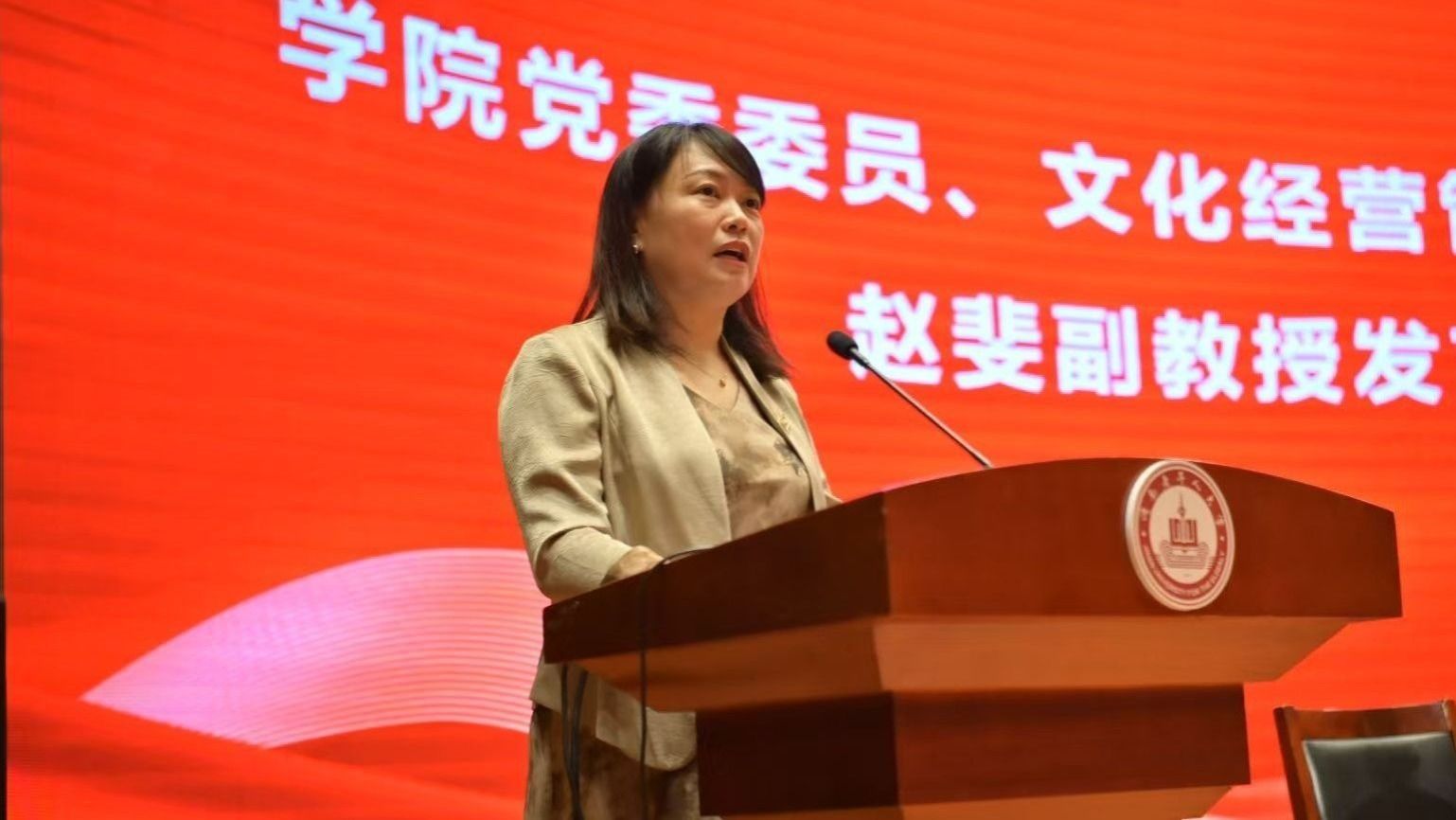 学院党委委员、文化经营管理系副主任赵斐老师作为教师代表发言,她表示,大学是探索知识、发现自我、塑造价值观的关键阶段。全体教师将恪尽职守,以精湛的学识、严谨的态度和温暖的关怀,做同学们学业上的引路人、成长中的知心友。她鼓励新生要知行合一、勤于思考、善于合作、积极实践,在知识的海洋中勇敢航行,找到属于自己的学术兴趣点。