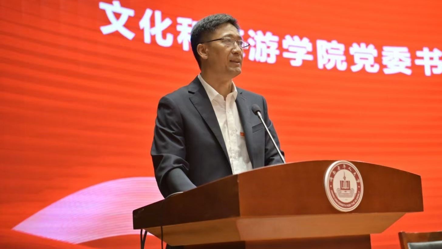 活动伊始,学院院长刘磊代表学院致辞,他首先向全体2025级新生表示最热烈的欢迎和最诚挚的祝贺。介绍了学院在人才培养、科学研究、社会服务等方面取得的丰硕成果。他指出,当今时代,文化和旅游深度融合已成为推动经济社会发展的重要引擎,作为未来的文旅英才,同学们生逢其时,重任在肩。他勉励新生要尽快完成角色转变,树立远大理想,既要博览群书、夯实专业基础,也要勇于实践、拓展国际视野,努力成长为有家国情怀、有专业本领、有创新精神、有责任担当的高素质复合型文旅人才。