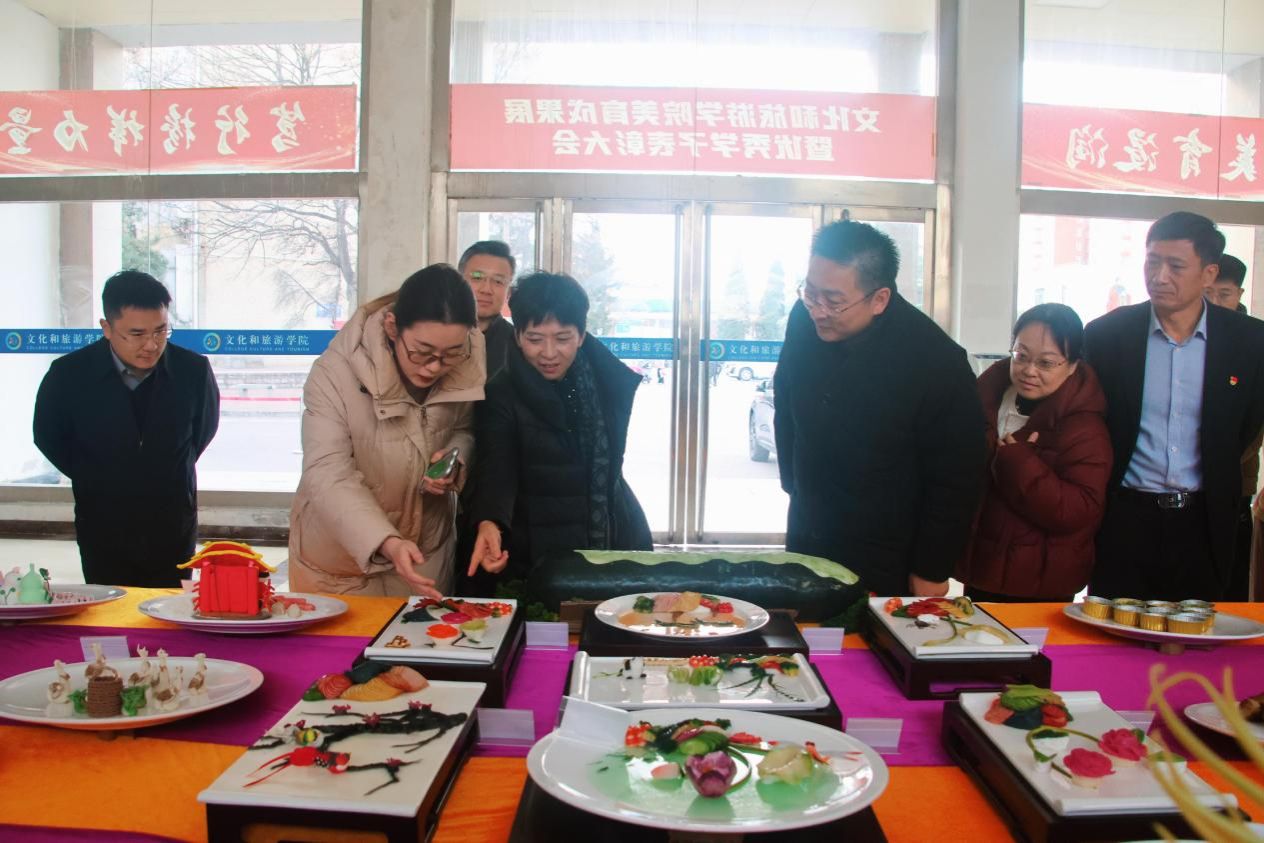 表彰仪式结束后,与会领导、师生移步展厅,共同参观了精彩纷呈的学院美育成果展。展览涵盖了食材雕刻、冷拼盘、中式面点、西式面点等四大板块。栩栩如生的雕刻作品、精巧别致的面点造型、色彩和谐富有创意的冷拼盘。每一件作品都凝聚着师生的智慧与汗水,是对“崇尚美、追求美、创造美”精神风貌的生动诠释。参观过程中,领导们频频驻足,仔细观看,并与现场师生亲切交流,对同学们将美学理念融入专业实践的能力给予高度赞赏。