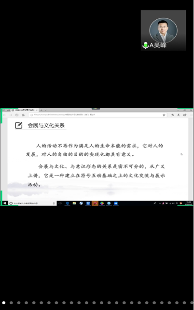 4月9日,讯狐国际科技有限公司总经理、中国会展经济研究会副秘书长、国际会展产业研究院副院长吴峰先生做客会展系《会展客户关系管理》在线课堂,以“会展文化符号哲学”为主题给同学们做了一堂富有哲理且具有实践指导意义的讲座。会展系主任徐艳芳教授出席讲座,会展系副主任王丽亚副教授主持讲座,会展经济与管理专业大一、大二、大三年级本科生参加了此次讲座。