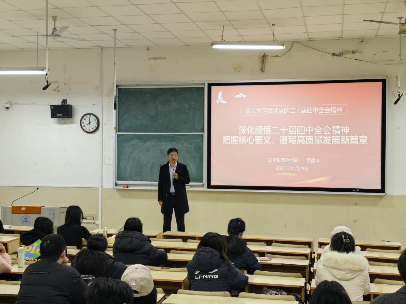 2025年11月29日,williamhill威廉希尔党委书记孟德洋在学院多媒体教室开展了党的二十届四中全会精神宣讲活动,以《深化细悟党的二十届四中全会精神,把握核心要义,谱写高质量发展新篇章》为题做宣讲报告。