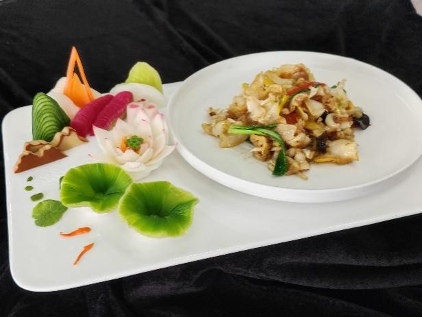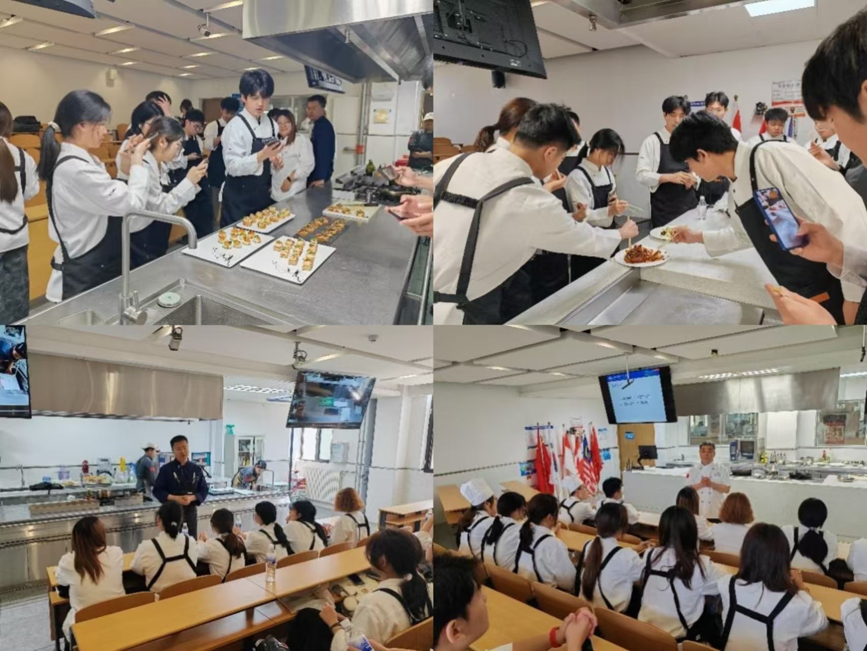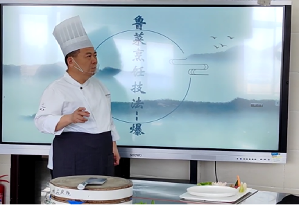 5月20日,同学们迎来了期待已久的大师课堂。国家级烹饪名师王振才现场演示经典鲁菜制作。“油爆海螺”选料讲究,爆炒时火猛手快,10秒的精准把控,让海螺肉脆嫩鲜香;“茄汁大黄鱼”现杀现做,茄汁酸甜比例完美,鱼肉鲜嫩无比。同学们近距离观察,深刻体会到鲁菜“一菜一格,百菜百味”的精髓。下午,西式烹饪大拿江云涛老师围绕三文鱼,带来五道创意菜式教学。从食材挑选到烹饪技巧,从摆盘美学的色彩搭配到营养逻辑的运用,无不展现出西餐对细节的极致追求,让同学们对国际化餐饮趋势有了初步认知。