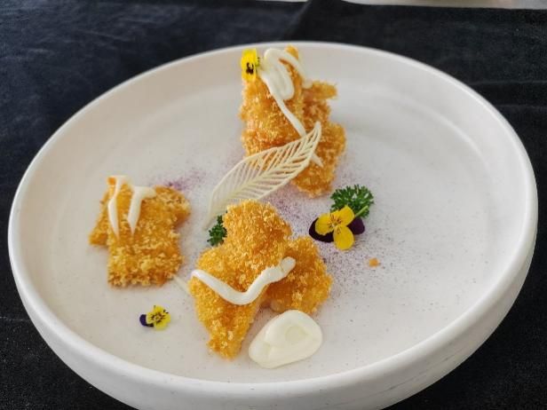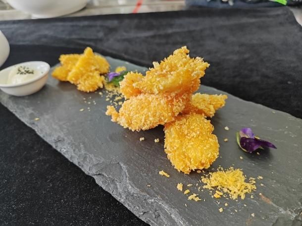 第三天,同学们赴烟台文化旅游职业学院。学院将胶东饮食文化深度挖掘,实训教室中的非遗文化展区,让同学们赞不绝口。在后续的学习中,中国烹饪大师、二级教授邓介强老师带来“海肠捞饭”“炸龙利鱼排”“油爆海螺”三款胶东名菜教学。“海肠捞饭”选用鲜活海肠,酱汁调配独家秘方;“炸龙利鱼排”对选材、腌制、裹粉和火候把控要求严格;“油爆海螺”选活螺,去腥增脆有妙招。同学们分组实操炸鱼排,从最初的手忙脚乱到在老师指导下炸出金黄酥脆的成品,收获满满成就感爆棚。