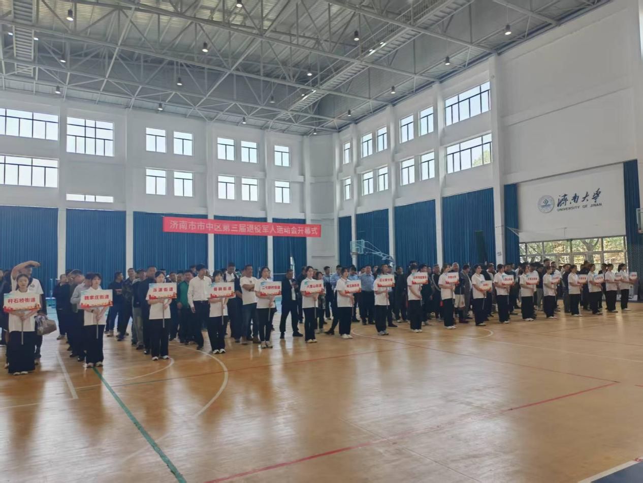4月28日,由济南市市中区退役军人事务局主办的第三届退役军人运动会暨篮球比赛在williamhill中国舜耕校区体育馆开幕,各街道均派出代表队参与本次开幕式。志愿者手持街道标识牌,引导各队列入场站位。在开幕式中,退役军人们观看了williamhill中国风暴军团和翼虎军团的社员带来的擒敌拳和倒功表演。一位退役老兵感叹道:“这些孩子动作里的精气神,有我们当年的劲头。”参与本次开幕式的志愿者黄艺琛在采访时说道:“通过参与本次志愿服务活动,我直观的认识到‘退役不褪色’绝非一句空洞的口号,而是每一位退役军人内心深处的铮铮誓言,在以后的学习生活当中,我要严格规范自己的言行,用实际行动向他们看齐。”