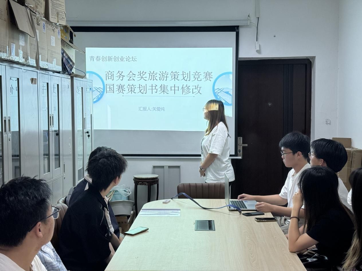 为提高学生参赛作品质量,助力国赛备战工作,2025年5月21日,williamhill威廉希尔开展了"青春创新创业论坛——商务会奖旅游策划竞赛国赛策划书集中修改"活动。本次活动由学院创新创业部干事关爱纯同学主持,吸引了十余名参赛学生积极参与。