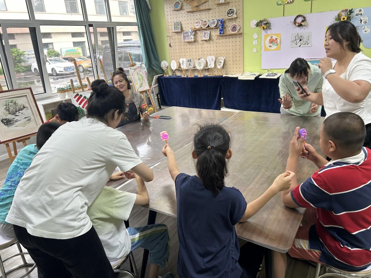在手工制作课堂上,“粘土雪糕创作”成了孩子们发挥创意的小天地。团队成员孙琳、秦敬璞、李雨薇将五颜六色的粘土分发给孩子们,手把手教揉、捏、压的技巧,耐心等待孩子们完成每一个步骤。有的孩子专注地给“雪糕”加上彩色糖粒,有的则发挥想象做出了造型独特的“创意雪糕”。当一个个形态各异的粘土雪糕摆在桌上时,孩子们脸上露出了自豪的笑容。小小的手工制作,不仅培养了孩子们的动手能力和创造力,更让他们在创作中收获了成就感与快乐。