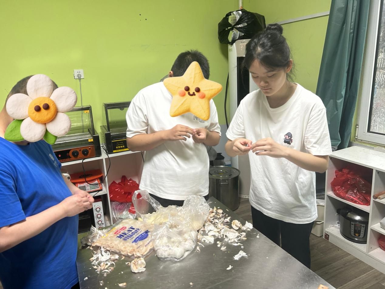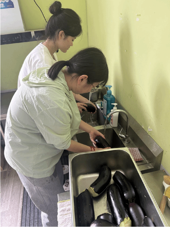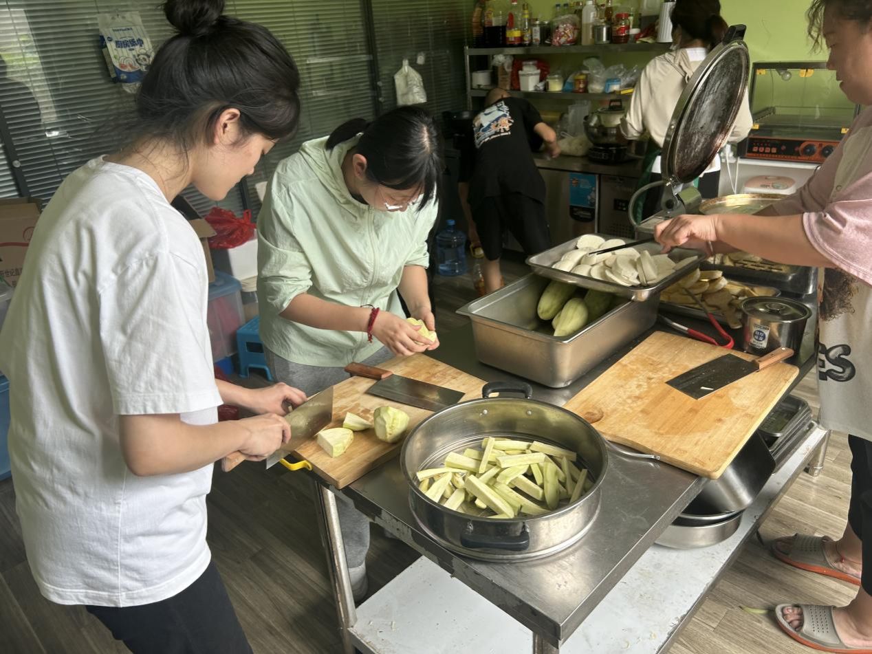 “我们一起来准备午餐的食材吧!”在厨房的操作台前,团队成员孙琳、秦敬璞、李雨薇与孩子们开启了一场特别的“厨艺合作”。剥蒜时,队员们示范着如何轻轻褪去蒜皮;处理茄子时,队员们将茄子认真清洗后切条,指导孩子们进行蒸制。孩子们认真模仿的模样,透着对生活的好奇与向往。当一个个蒜瓣剥净、一根根茄子切好、一屉屉茄条蒸熟,大家脸上都洋溢着劳动的喜悦。这场厨房协作,不仅让孩子们体验了劳动的乐趣,更在分工合作中培养了他们的生活技能与团队意识。