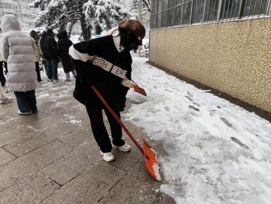 2025 级的新生们带着学院下发的扫帚、铁锹、雪推板,按照预先分配的区域迅速投入 “战斗”:教学楼入口处,他们弯腰弓背,用扫帚细细清扫台阶缝隙的薄冰,生怕过往师生脚下打滑;主干道上,有人奋力挥动铁锹铲破冰层,“咚咚” 的声响成了冬日里的奋进节拍;有人推着雪推板将积雪整齐堆到绿化带旁,还有人合力搬运厚重的雪堆 —— 分工明确、配合默契,动作虽略显生疏,却透着一股不服输的韧劲。