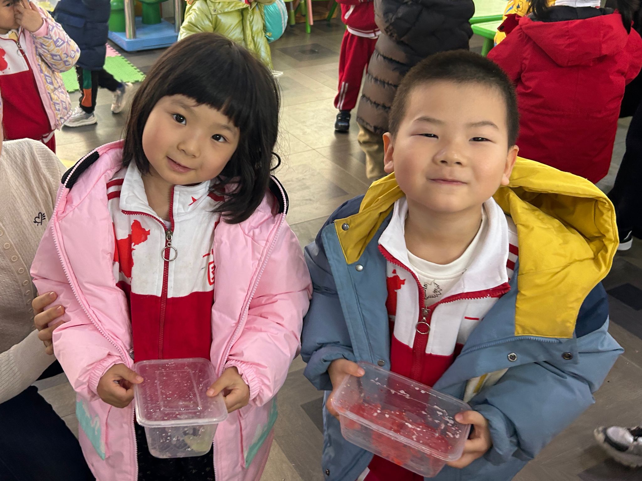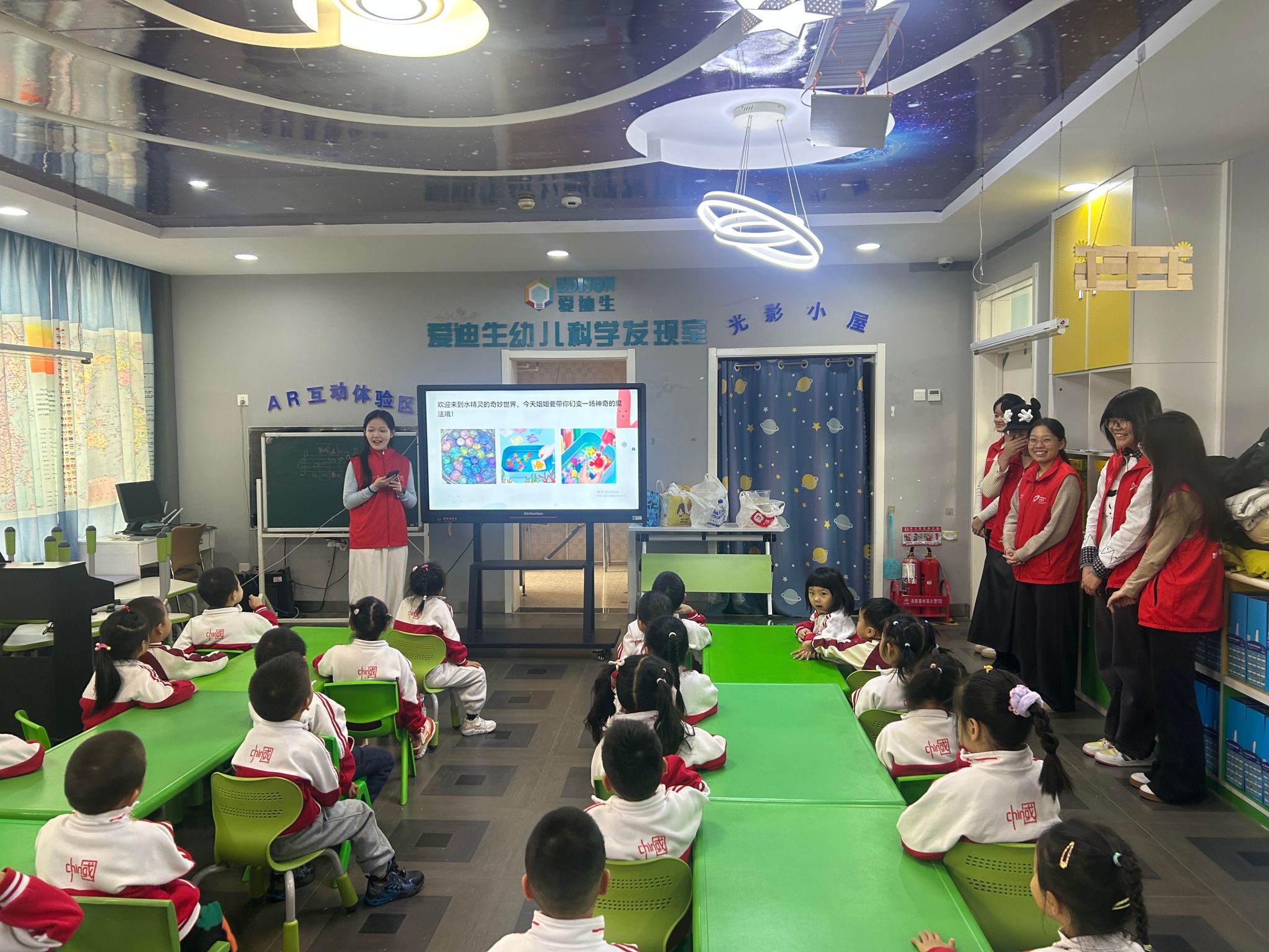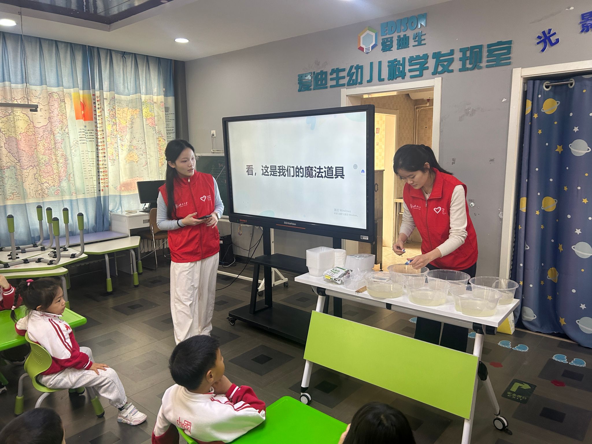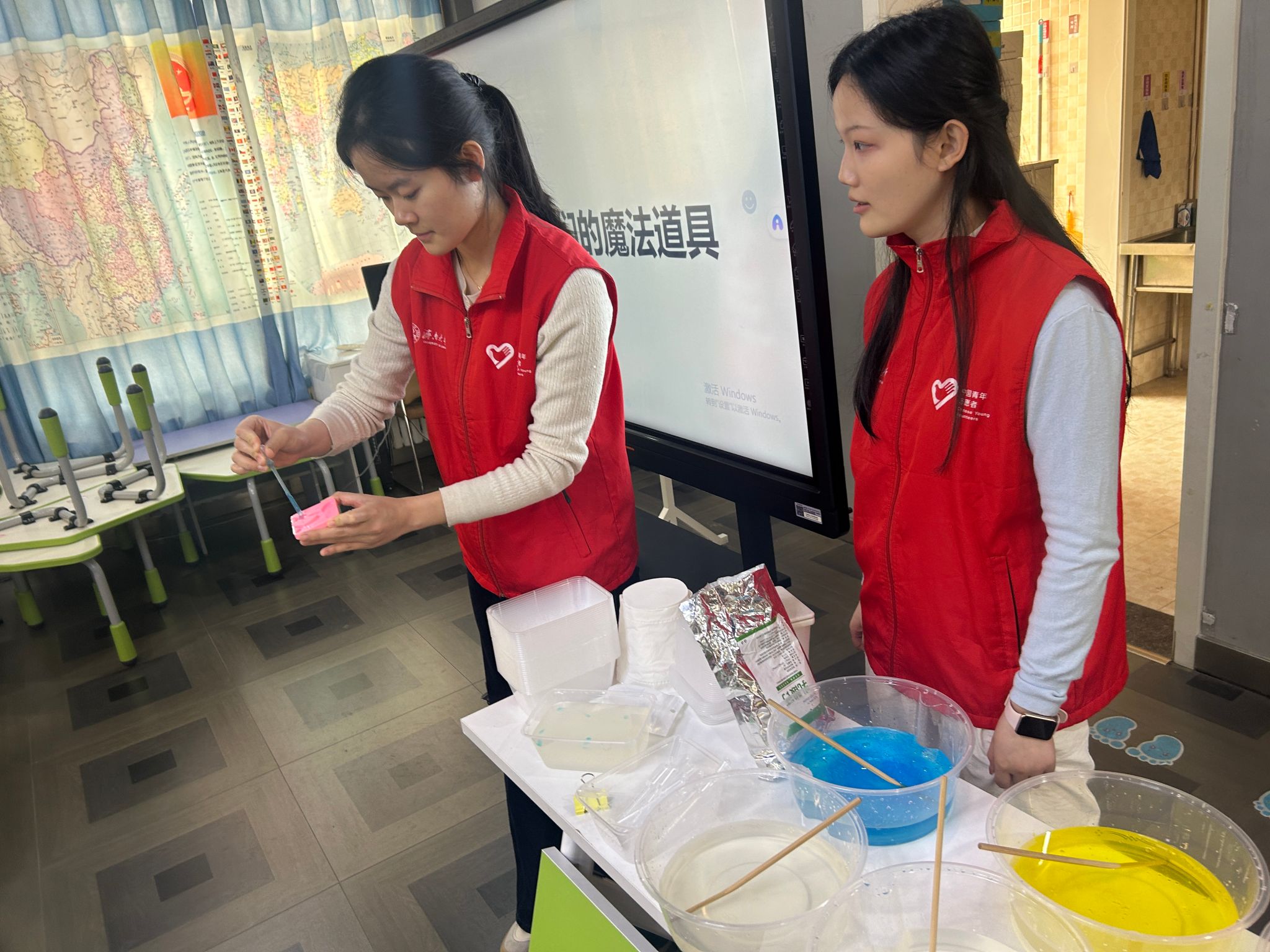 活动现场,色彩认知的趣味互动率先拉开帷幕。志愿者摆出六只透明塑料盒,逐一滴入不同色号的食品级色素,借着“红色与黄色相融会幻化出什么色彩”的提问,引导孩子们观察液体交融的奇妙过程。孩子们的目光追随着色彩的渐变流转,此起彼伏的猜想声让教室充满童趣,也为后续的科学实验埋下好奇的种子。