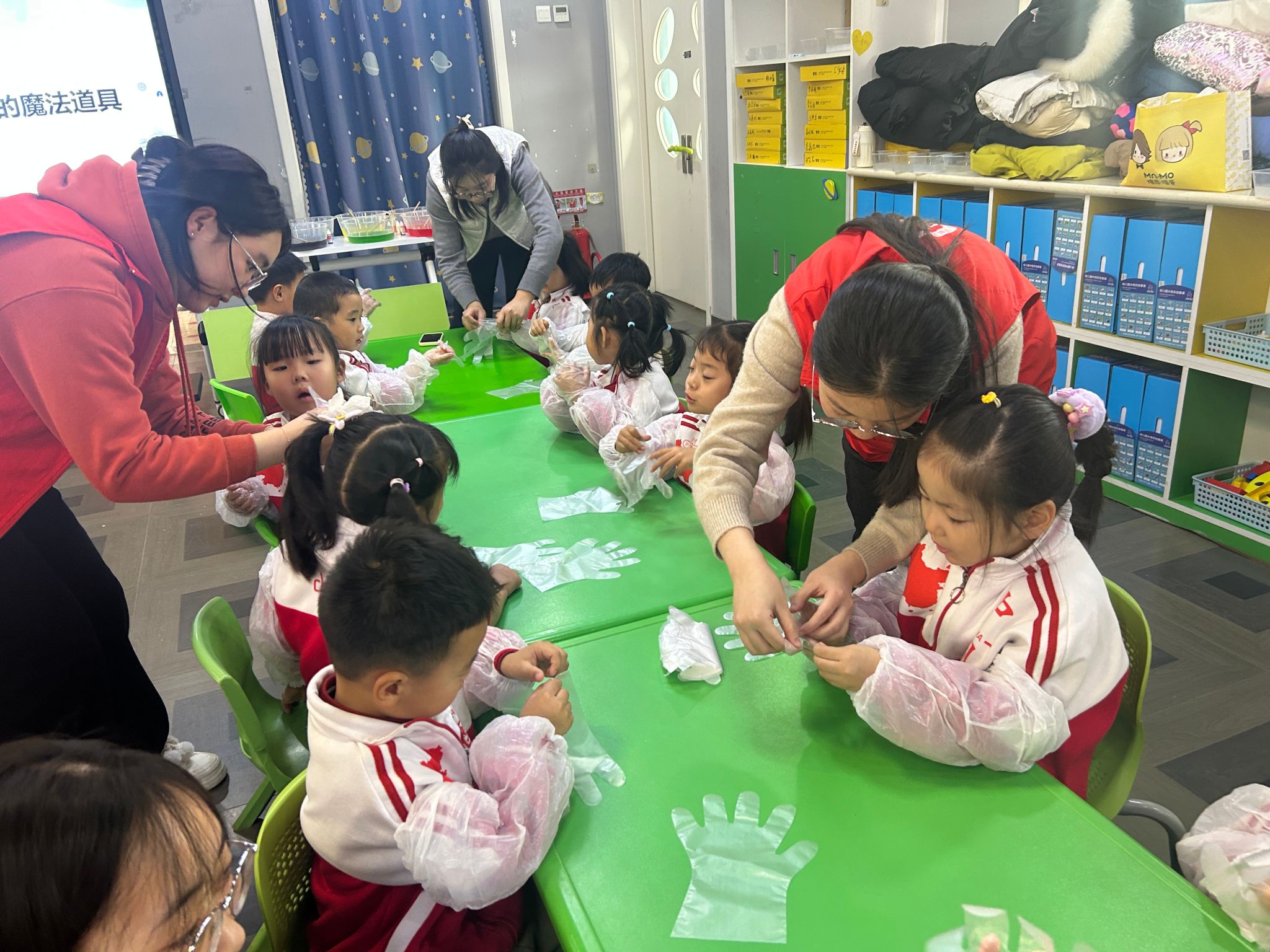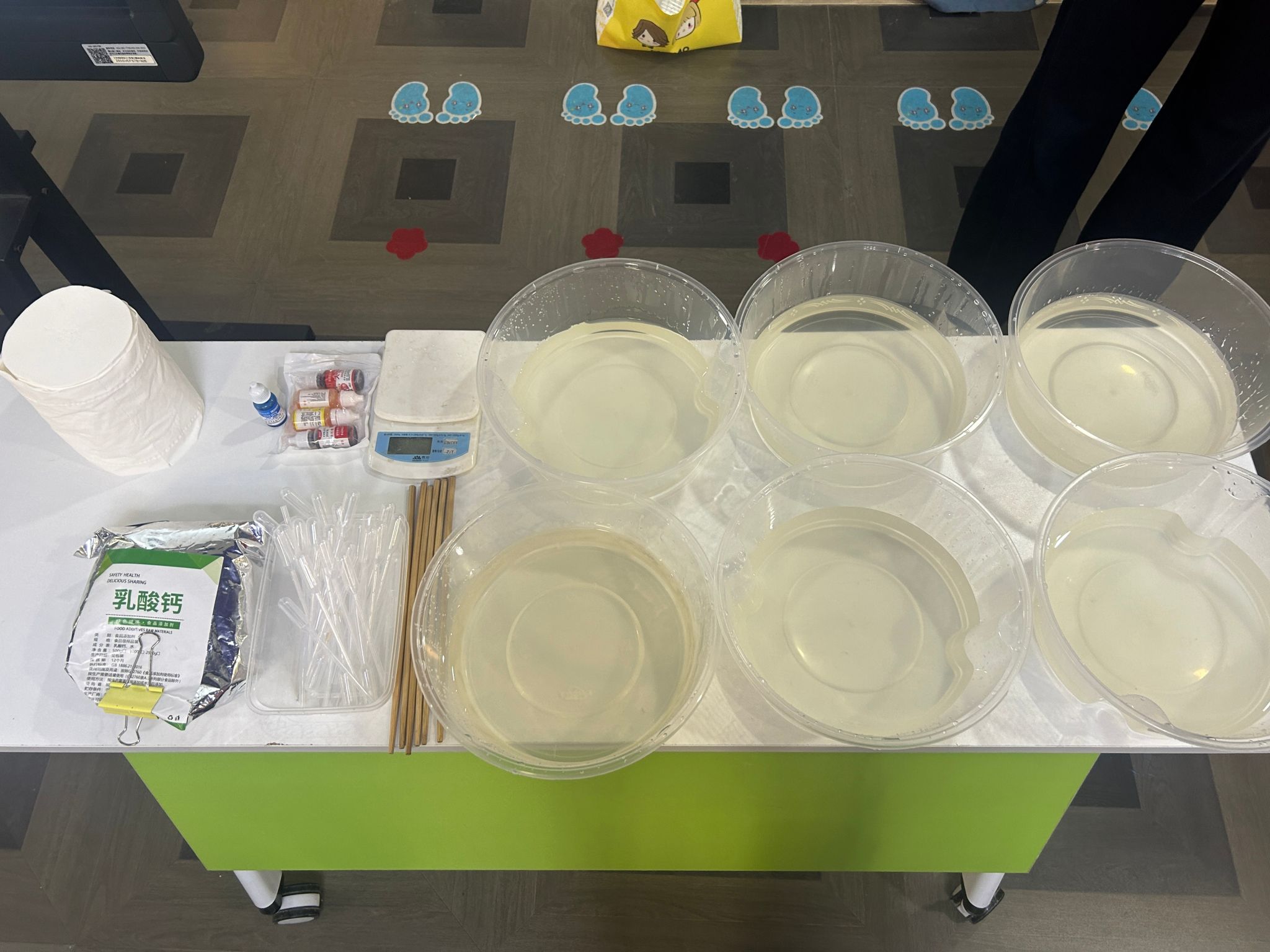作为活动核心的“水精灵”制作环节,正是对奶茶爆爆珠球化技术的趣味复刻。志愿者将食品级海藻酸钠溶液命名为“彩色魔法药水”,乳酸钙溶液称作“凝固魔法水”,用童趣化的表达消解科学原理的陌生感。展示结束后,志愿者笑着告诉孩子们,要成为真正的“小魔法师”,还得穿上专属的“魔法服装”,随后逐一为孩子们戴上手套和套袖,孩子们看着自己的装备,眼中满是期待,迫不及待要开启动手实践。