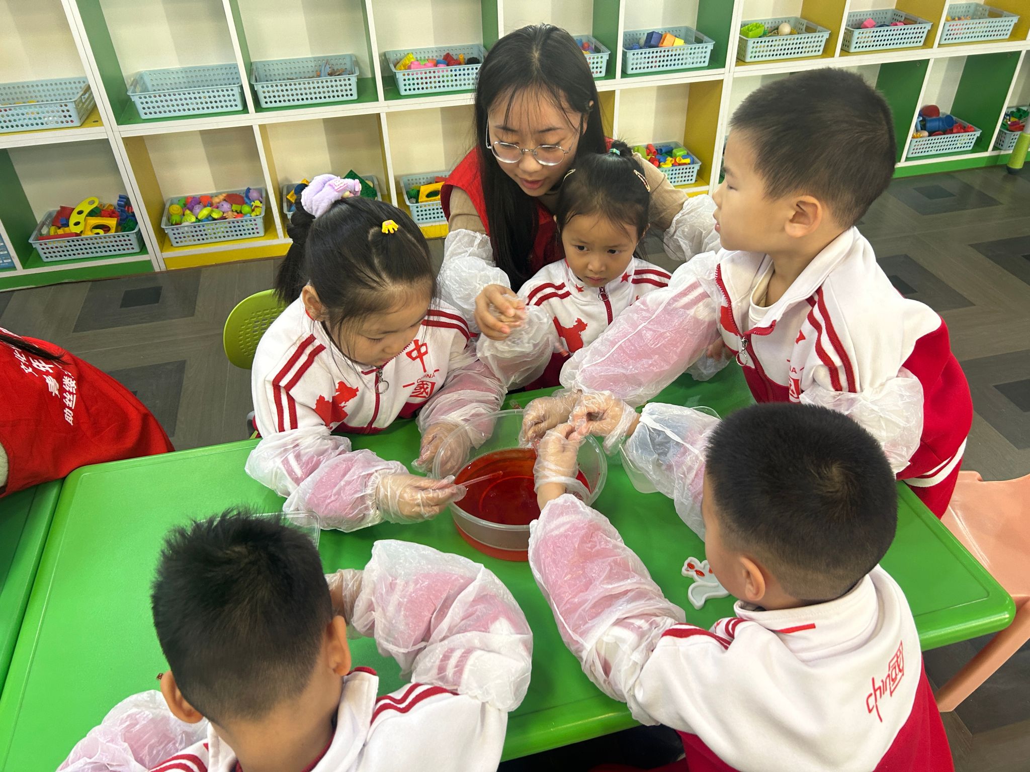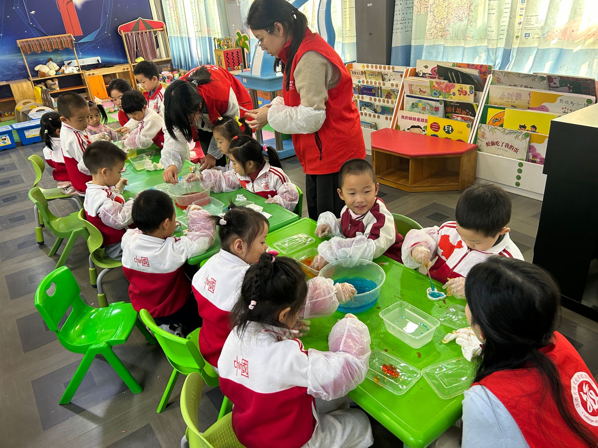 活动全程,志愿者们始终将安全置于首位。所有实验材料均选用食品级原料,且反复强调“不可食用”的原则,师生配比也严格遵循安全标准,确保孩子们能安心探索。烹饪与营养教育专业的志愿者们,将专业课堂中的分子料理知识拆解为幼儿可感知、可操作的实验步骤,让原本抽象的化学反应,变成了看得见、摸得着的趣味体验。
