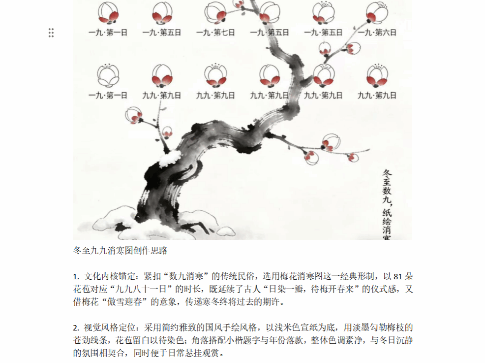 “指尖藏冬,暖意相传”板块则点燃了学子们的创作热情,大家巧用卡纸、黏土、落叶等常见材料,亲手制作饺子摆件、冬至主题书签、剪纸窗花等手工作品。在拍摄作品之余,还详细分享了创作思路,每一件作品都凝聚着对冬至文化的理解与对生活的热爱。而在“冬至数九,纸绘消寒”板块中,同学们挥毫展才,精心绘制九九消寒图,或勾勒梅花枝干,或设计民俗纹样,于笔墨间感受“数九寒天至,春暖花开时”的节气韵律,传递对冬日的期许与对团圆的向往。