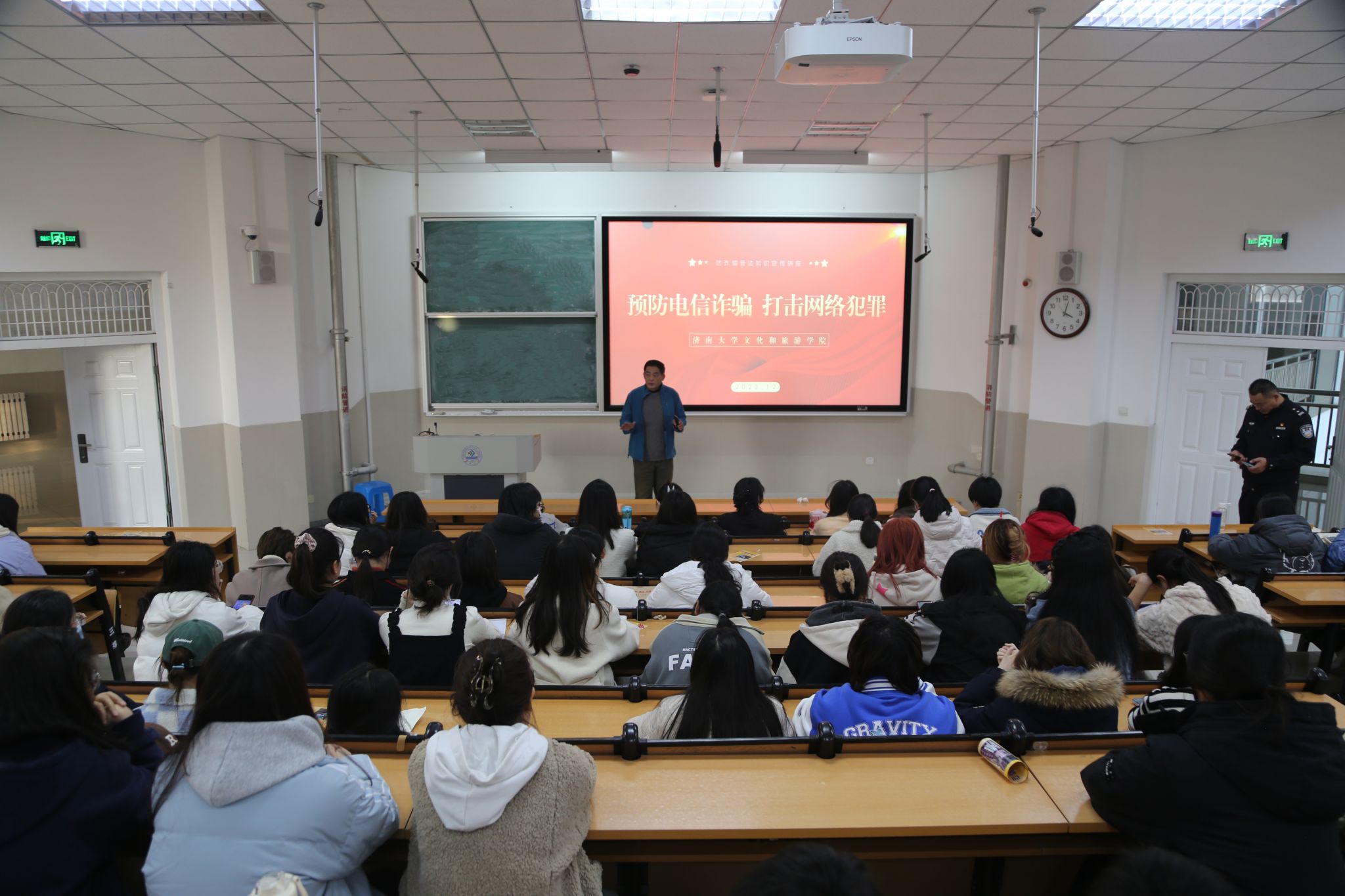 为提升学生反诈意识、增强反诈能力,切实做好安全教育,进一步筑牢学院安全屏障。12月5日下午,学院联合我校保卫处,邀请济南市公安局舜玉路派出所在舜耕校区三教201教室开展了防范电信诈骗宣传讲座。济南市公安局舜玉路派出所副所长孙全修警官、学校保卫处舜耕校区保卫科科长张韶春、学办部分老师及200余学生参加此次活动。讲座由学办老师王明扬主持。