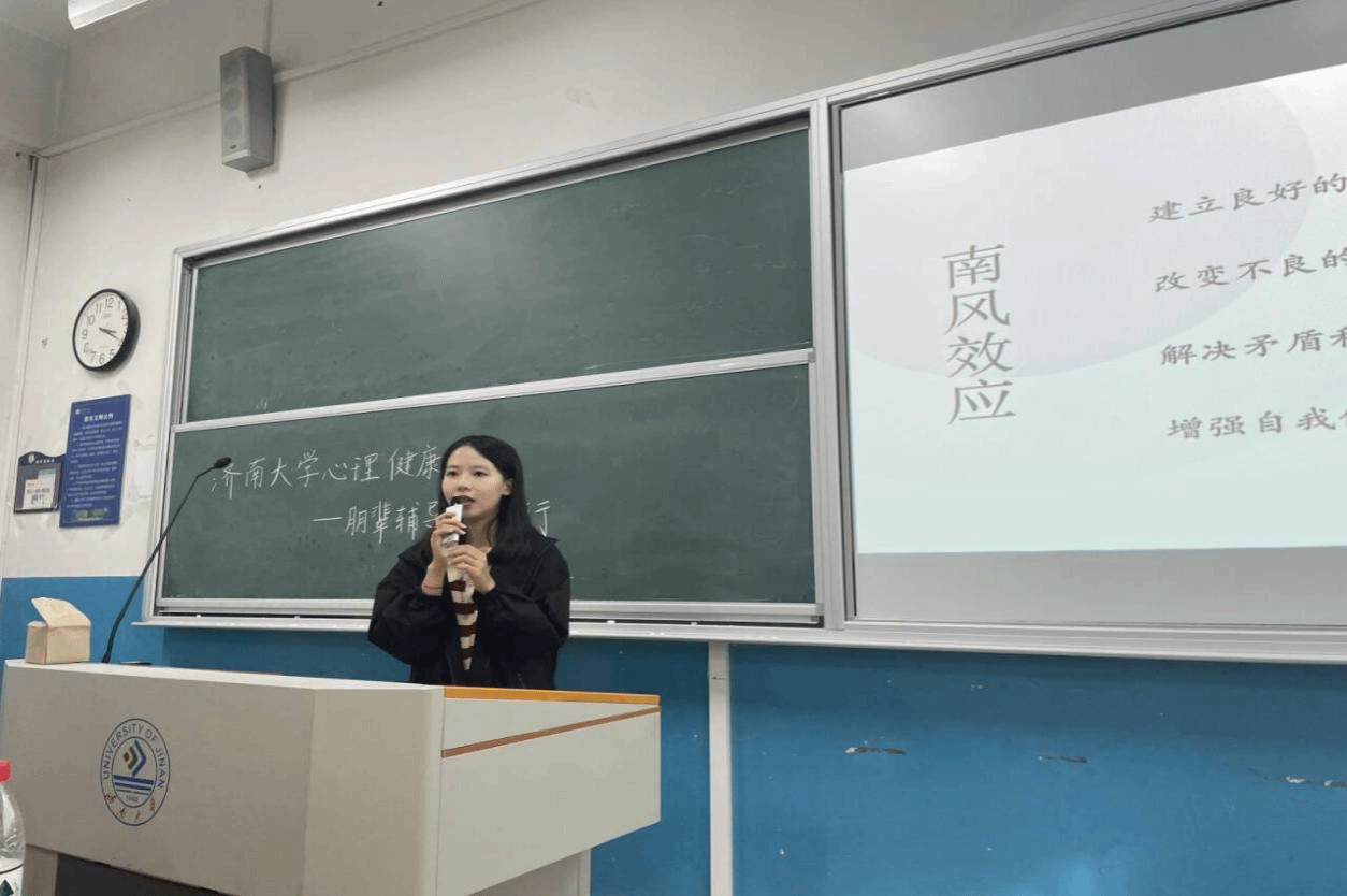 在宣讲过程中,见习小组给同学们普及了富兰克林效应、南风效应等常见的心理学效应,并针对大学生适应问题提出了合理细致的对策。此次心理健康教育培训的开展,不仅传授了同学们许多交往技巧,而且帮助同学们了解了心理健康的意义,也正确认识了心理咨询。