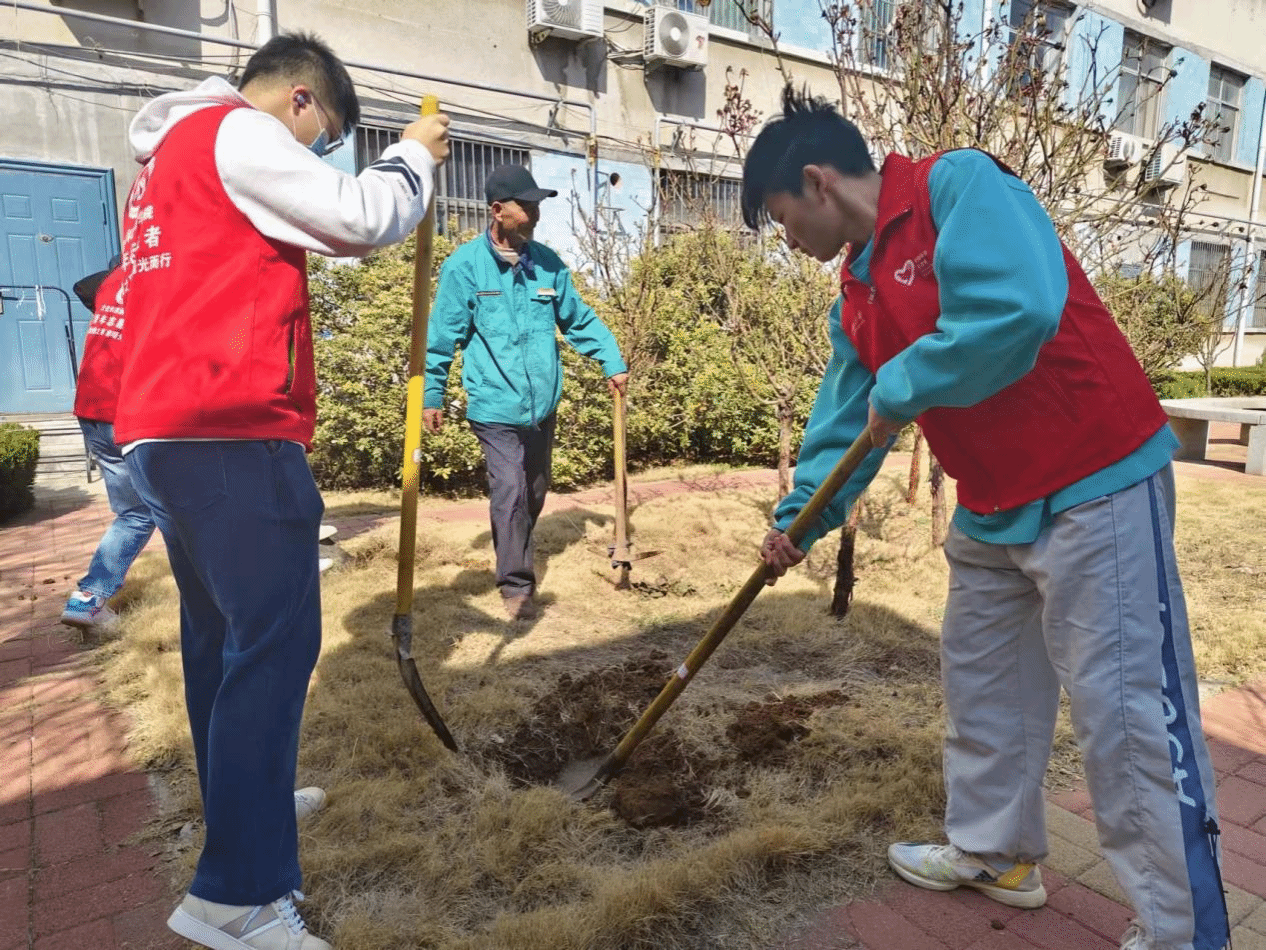 为了给树苗创造适宜的生长环境,活动当天,志愿者们分工合作,有序清扫枯枝落叶,处理场地垃圾。活动组织者骆敬茹同学在现场向志愿者们介绍植树节的来历。她谈到,植树节的起源与孙中山先生有着密切联系,他最早意识到森林重要性并号召植树造林。为帮助同学们充分了解植树的步骤和原理,学院还邀请了园林部门工作人员对同学们进行指导。志愿者们认真学习植树技巧,从挖坑、培土到浇水,每一个环节都井然有序。经过一上午的努力,新栽种的棵棵小树苗迎风而立,为文旅楼增添新的生机与活力。活动最后,同学们将写有对未来美好期望的丝带悬挂在枝头,寓意为“‘植’得期待”,在这里,我们衷心祝愿他们的期望都能迎风飘扬。