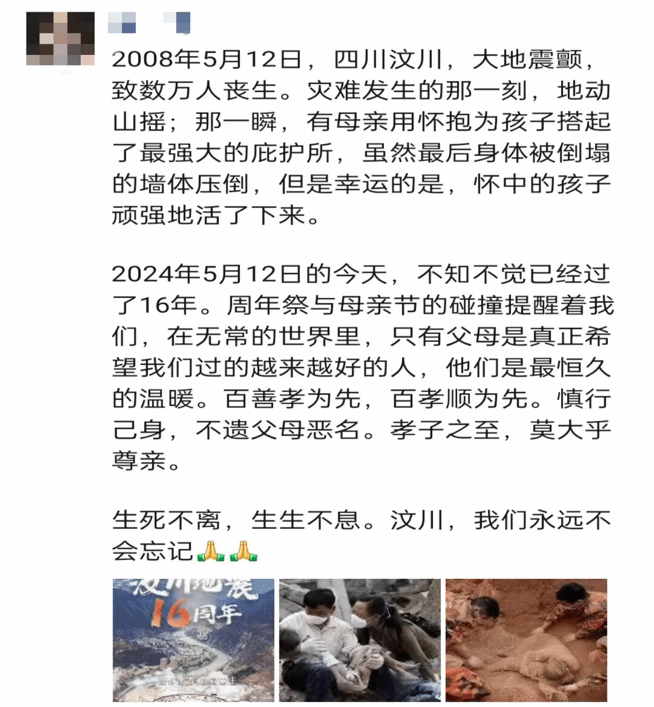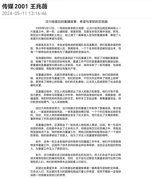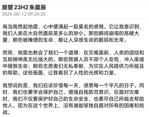 本次活动分为主题宣讲和宣传感悟两部分。宣讲当天,大家向在“5·12”汶川大地震中死难的同胞默哀,回顾历史,分享英雄事迹,缅怀抗震救灾英雄不惧牺牲、无私奉献的伟大精神。面对抗震救灾的历史画面,同学们被深深地触动,他们为在灾难中失去家园和生命的人们感到悲痛,也对无私奉献、英勇救灾的人们致以敬佩。随后,大家观看防震科普视频,学习防震防灾必备技能。宣讲结束后,活动参与同学在线上社交平台通过分享防灾减灾知识和个人感悟,展示汶川地震后的重建故事,号召大家提高防震减灾意识,铭记历史,缅怀先烈。同时,同学们将防灾宣传语如“密切关注预警信息”“提前准备应急物资”“制定应急方案”等写在便利贴上制作成活动展板帮助全院同学普及防震减灾知识。活动参与者陈言涵表示,她会时刻铭记历史,缅怀先烈,同时会牢记了解到的防震知识,在必要的时候能够冷静应对。