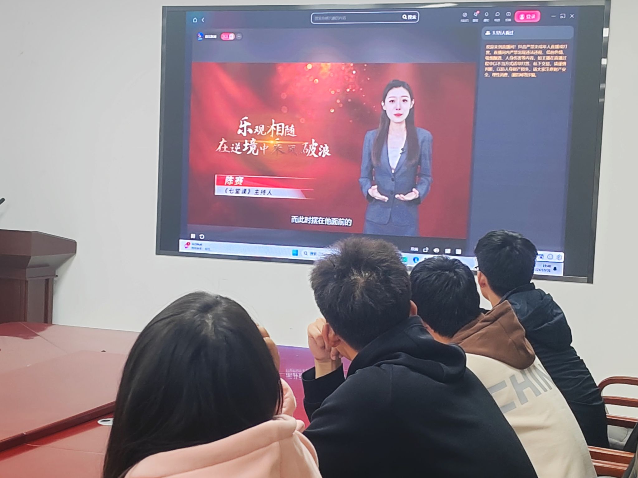 为丰富学生的精神世界,提升学生在面对逆境时的应对能力,10 月 31 日晚,williamhill威廉希尔学生会于文旅楼212组织观看“思想的力量”主题讲座——《乐观相随,在逆境中乘风破浪》。同学们踊跃参加,部分部长和干事到场学习,其余同学通过抖音直播形式完成学习。