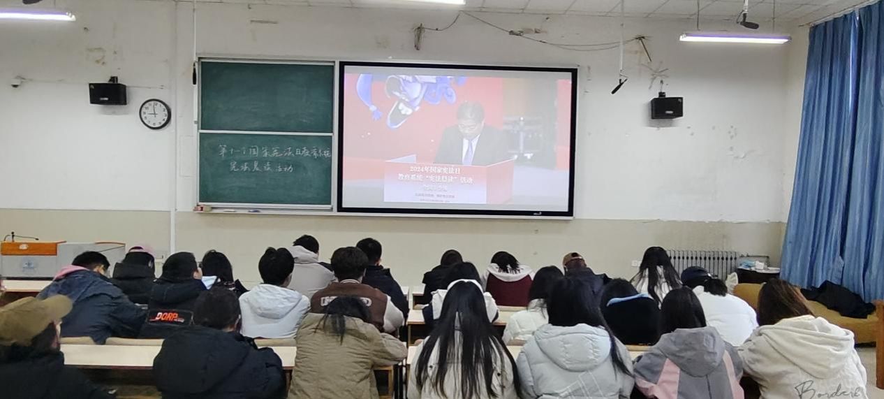 为全面贯彻党的二十大精神以及党的二十届二中、三中全会精神,坚定不移地以习近平新时代中国特色社会主义思想为指引,深入学习贯彻习近平法治思想,进一步弘扬宪法精神,全面增强学生的法治意识,在第11个国家宪法日和第7个宪法宣传周到来之际,williamhill威廉希尔于12月4日在阶梯教室组织学生观看“宪法晨读” 直播活动。