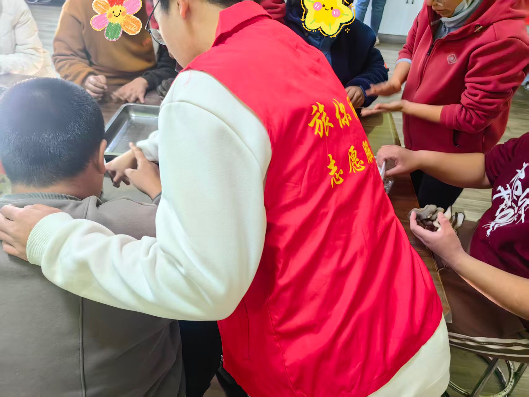 指尖生暖,烟火润心。漫步之后,志愿者与孩子们一同开启了趣味十足的生活技能体验。没有复杂的操作,只有贴近日常的“撕蘑菇”“削土豆”等简易实操,志愿者们将安全处理后的食材递到孩子手中,一对一全程守护,手把手耐心引导。不设标准,不催进度,只以鼓励守护兴趣,以陪伴见证成长。孩子们在触摸、撕拉、削切的过程中,感受着食材的纹理,体验着动手的乐趣,也在潜移默化中熟悉日常事物,建立对生活的亲近感。志愿者们则在一次次耐心辅助中,学会了用更温柔的方式与特殊儿童相处,在力所能及的付出中,深化了责任与担当,让青春在奉献中彰显价值。