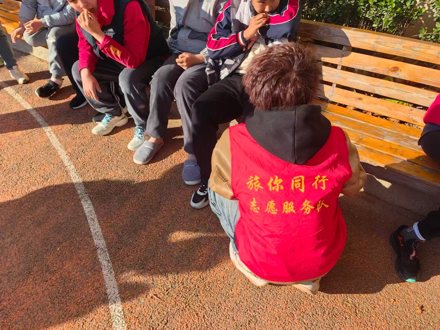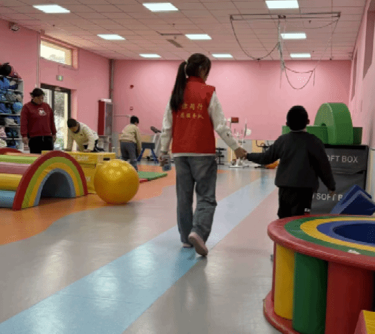 随后,志愿者们来到康复训练区,协助手脚不灵活的孩子进行康复训练。面对孩子们的不便,志愿者们始终保持耐心与细心,轻轻搀扶、温柔引导,陪伴孩子们完成各项恢复任务。从肢体伸展到平衡练习,志愿者们全程专注守护,用鼓励的话语给予孩子们力量,用坚定的陪伴助力他们康复成长,每一个细微的动作都饱含着关爱与责任。